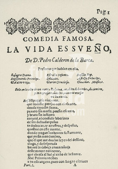 akg5432574 Calderon de la Barca, Pedro; spanischer Schriftsteller, Dramatiker; 1600-1681. Werke: La vida es sueno - Das Leben ist ein Traum (UA 1635). Erste Seite der ersten Ausgabe der Komödien des Calderon de la Barca. Madrid 1640.