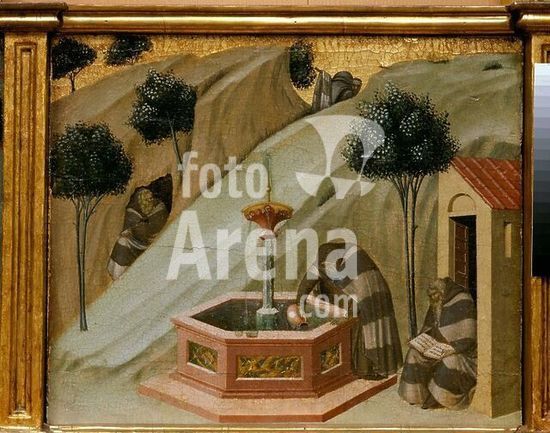 akg614126 Lorenzetti, Pietro. c. 1280 - 1348. "Carmelite hermits at the well of Elias", 1329. Predella, altar of the Chiesa del Carmine, Siena. Tempera on wood, 38 × 93 cm. I.B.S. no. 16 b. Siena, Pinacoteca Nazionale. Museum: Siena, Pinacoteca Nazionale.