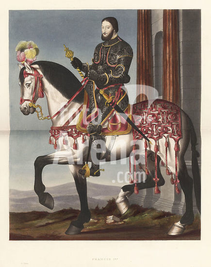 alb18718878 Francis I or Francois I, King of France, 1494-1547. In suit of gilt-engraved black armour, holding a sceptre, mounted on a horse with plumes and crimson caparison. After a miniature equestrian portrait by Jean Clouet. Handcoloured woodblock engraving by Henry Shaw from his own Dresses and Decorations of the Middle Ages from the 7th to the 17th Centuries, William Pickering, London, 1843.