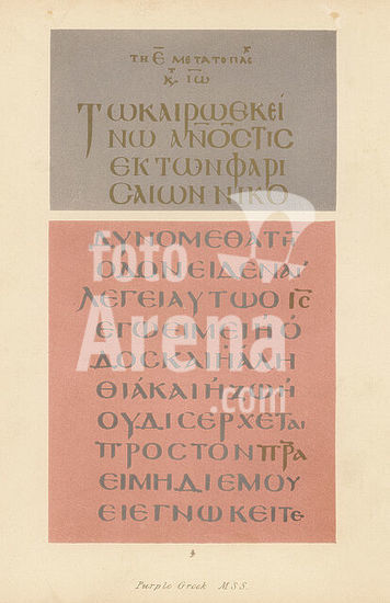 alb18720854 Purple Greek manuscripts with gold or silver letters. St. John's Gospel, from the Vienna Evangelistiarium, and from Cottonian MS Titus V XV. Chromolithograph after an illustration by John Obadiah Westwood from his own Palaeographia Sacra Pictoria, being a series of Illustrations of the Ancient Versions of the Bible, copied from Illuminated Manuscripts, William Smith, London, 1843.