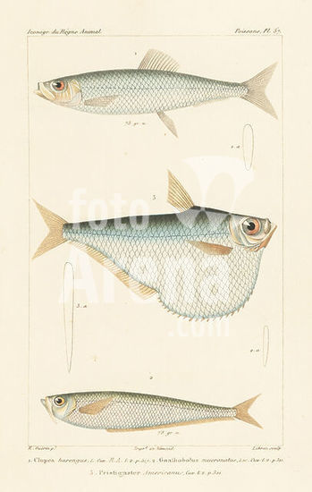 alb18724565 Atlantic herring, Clupea harengus 1, Guiana longfin herring, Odontognathus mucronatus 2, and Amazon hatchet herring, Pristigaster cayana 3. Handcoloured stipple copperplate engraving by Eugene Giraud after an illustration by Felix-Edouard Guérin-Méneville from Guérin-Méneville's Iconographie du règne animal de George Cuvier, Iconography of the Animal Kingdom by George Cuvier, J. B. Bailliere, Paris, 1829-1844.