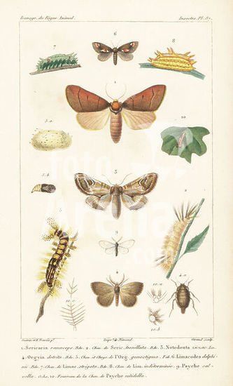 alb18738595 Post-burn datana moth, Datana ranaeceps 1, pale tiger moth caterpillar, Halysidota tessellaris 2, pebble prominent, Notodonta ziczac 3, fir tussock moth, Orgyia detrita 4, rusty tussock pupa and larva, Orgyia antiqua 5, spiny oak slug, Euclea delphinii 6, slug moth larva, Limacodes strigata 7, unknown larva 8, and Sterrhopterix fusca 9. Handcoloured stipple copperplate engraving by Eugene Giraud after an illustration by Felix-Edouard Guérin-Méneville and Édouard Traviès from Guérin-Méneville's Iconographie du règne animal de George Cuvier, Iconography of the Animal Kingdom by George Cuvier, J. B. Bailliere, Paris, 1829-1844.