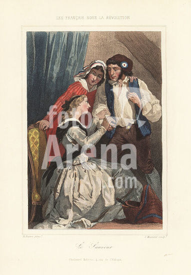 alb18739961 A noblewoman accepts the help of a revolutionary in tricolor cockade. She begs him with both hands to save her during the reign of Terror. The saviour. Le Sauveur. Handcoloured steel engraving by Leopold Massard after an illustration by Henri Baron from Augustin Challamel and Wilhelm Tenint's Les Francais sous la Revolution, The French under the Revolution, Challamel, Paris, 1843.