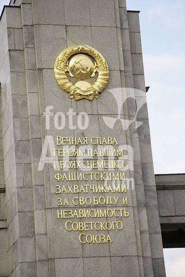 alb18938265 Berlin, Germany. Soviet War Memorial in the Tiergarten (Sowjetisches Kriegerdenkmal). Memorial inaugurated on 7 November 1945, on the anniversary of the beginning of the October Revolution in Russia. It commemorates Soviet soldiers who died in the war, especially those who died during the Battle of Berlin, which took place between April and May 1945. The monument is located in the Großer Tiergarten, a large public park in the west of the city. It was built with stone from the destroyed Chancellery of the Third Reich. Its design was the work of architect Mikhail Gorvits. Inscription relating to the Soviet victory on the central column of the memorial.