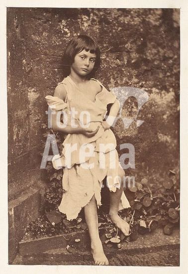 alb3622870 Alice Liddell as "The Beggar Maid". Artist: Lewis Carroll (British, Daresbury, Cheshire 1832-1898 Guildford). Dimensions: Image: 16.3 x 10.9cm (6 7/16 x 4 5/16in.)Mount: 14 1/8 in. × 10 7/8 in. (35.8 × 27.6 cm). Subject: Alice Pleasance Liddell (British, 1852-1934). Date: 1858.Known primarily as the author of children's books, Lewis Carroll was also a lecturer in mathematics at Oxford University and an ordained deacon. He took his first photograph in 1856 and pursued photography obsessively for the next twenty-five years, exhibiting and selling his prints. He stopped taking pictures abruptly in 1880, leaving over three thousand negatives, for the most part portraits of friends, family, clergy, artists, and celebrities. Ill at ease among adults, Carroll preferred the company of children, especially young girls. He had the uncanny ability to inhabit the universe of children as a friendly accomplice, allowing for an extraordinarily trusting rapport with his young sitters and enabling him to charm them into immobility for as long as forty seconds, the minimum time he deemed necessary for a successful exposure. The intensity of the sitters' gazes brings to Carroll's photographs a sense of the inner life of children and the seriousness with which they view the world.Carroll's famous literary works, "Alice's Adventures in Wonderland" (1865) and "Through the Looking Glass and What Alice Found There" (1872), were both written for Alice Liddell, the daughter of the dean of Christ Church, Oxford. For Carroll, Alice was more than a favorite model; she was his "ideal child-friend," and a photograph of her, aged seven, adorned the last page of the manuscript he gave her of "Alice's Adventures Underground." The present image of Alice was most likely inspired by "The Beggar Maid," a poem written by Carroll's favorite living poet, Alfred, Lord Tennyson, in 1842. If Carroll's images define childhood as a fragile state of innocent grace threatened by the experience of growing up and the demands of adults, they also reveal to the contemporary viewer the photographer's erotic imagination. In this provocative portrait of Alice at age seven or eight, posed as a beggar against a neglected garden wall, Carroll arranged the tattered dress to the limits of the permissible, showing as much as possible of her bare chest and limbs, and elicited from her a self-confident, even challenging stance. This outcast beggar will arouse in the passer-by as much lust as pity. Indeed, Alice looks at us with faint suspicion, as if aware that she is being used as an actor in an incomprehensible play. A few years later, a grown-up Alice would pose, with womanly assurance, for Julia Margaret Cameron. Museum: Metropolitan Museum of Art, New York, USA.