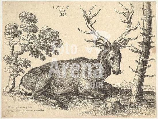 alb3638276 Stag lying to right. Artist: After Albrecht Dürer (German, Nuremberg 1471-1528 Nuremberg). Dimensions: sheet: 3 3/8 x 4 7/16 in. (8.5 x 11.3 cm)cut c. 2 x 2 mm in height and width. Etcher: Wenceslaus Hollar (Bohemian, Prague 1607-1677 London). Date: 1649.Stag lying to right, with head in three-quarter profile; conifer tree at right, deciduous tree at left; with Dürer's monogram above; after Dürer (?). Museum: Metropolitan Museum of Art, New York, USA.