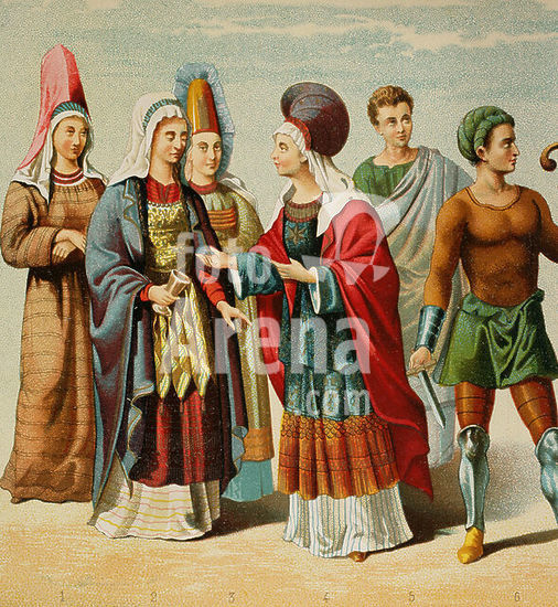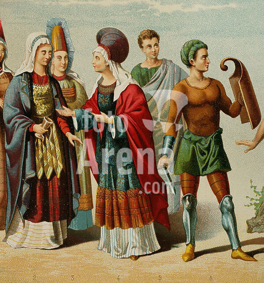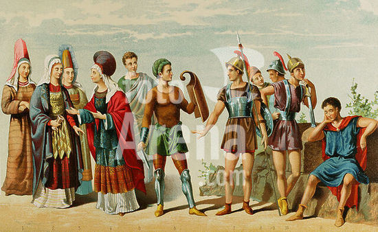 alb5516420 Iberian Peninsula. Ancient History. From left to right; figures 1 to 6: Phoenicians, figures 7 to 11: Celtiberians. Chromolithography. Historia General de España, by Modesto Lafuente. Volume I. Published in Barcelona, 1877.