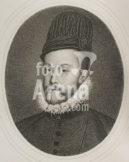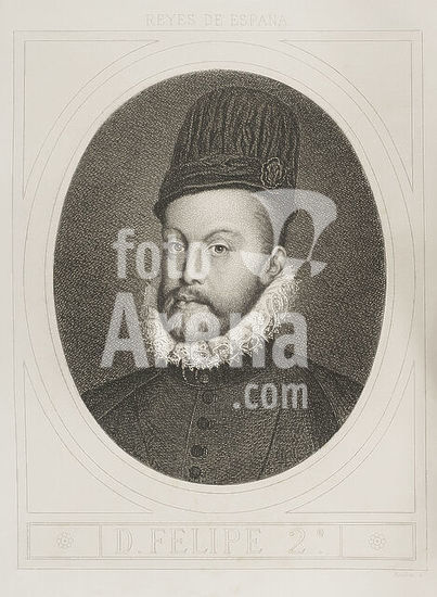 alb5516397 Philip II (1527-1598). King of Spain (1556-1598). Son of Emperor Charles V and Isabella of Portugal. Portrait. Engraving by Masson. Lithographed by Magín Pujadas. Historia General de España, by Modesto Lafuente. Volume III. Published in Barcelona, 1879. Author: Magín Pujadas. 19th-century Spanish engraver and lithographer. Alphonse Masson (1810/14-1898). French etcher.