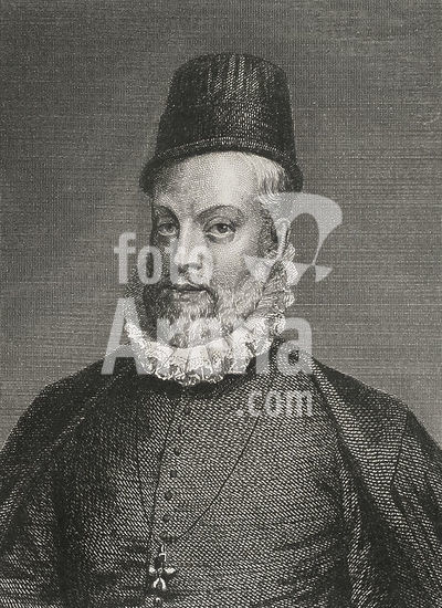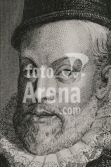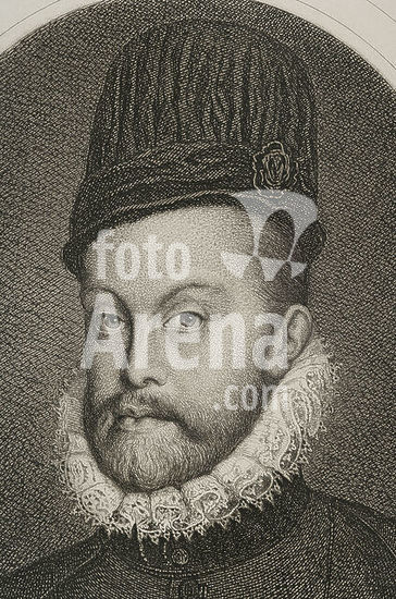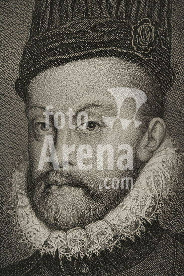 alb5516427 Philip II (1527-1598). King of Spain (1556-1598). Son of Emperor Charles V and Isabella of Portugal. Portrait. Detail. Engraving by Masson. Lithographed by Magín Pujadas. Historia General de España, by Modesto Lafuente. Volume III. Published in Barcelona, 1879. Author: Magín Pujadas. 19th-century Spanish engraver and lithographer. Alphonse Masson (1810/14-1898). French etcher.