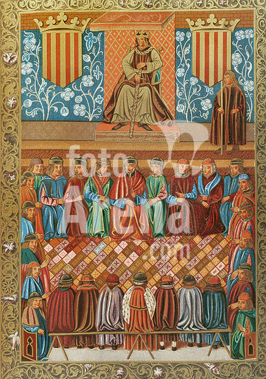 alb5516431 James I the Conqueror (1208-1276). Count of Barcelona and King of Aragon (1213-1276), Valencia (1239-1276) and Majorca (1229-1276). Illustration after a miniature from the incunabulum "Constitutions and Other Rights of Catalonia", 1495. Jaime I presiding over the Courts of Lerida on 3rd March 1242. At his right, the prothonotary. In front of him, on the benches, representatives of the "three braços" or estates. Chromolithography. Historia General de España, by Modesto Lafuente. Volume I. Published in Barcelona, 1877.