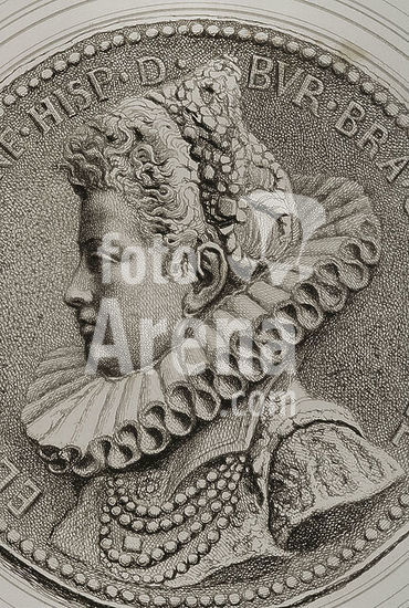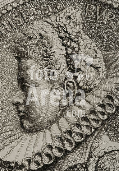 alb5516437 Isabella Clara Eugenia (1566-1633). Infanta of Spain, sovereign of the Spanish Netherlands (1598-1621) and governor of the Low Countries (1621-1633) with her husband, Archduke Albert VII. The daughter of King Philip II of Spain and Elizabeth of Valois. Portrait. Engraving by Masson. Lithographed by Magín Pujadas. Historia General de España, by Modesto Lafuente. Volume III. Published in Barcelona, 1879. Author: Magín Pujadas. 19th-century Spanish engraver and lithographer. Alphonse Masson (1810/14-1898). French etcher.