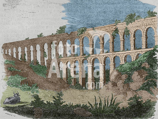 alb5519753 Spain, Catalonia. Aqueduct of Tarragona, also known as the Bridge of Ferreres or Pont del Diable. It was built during the time of Emperor Augustus (63 BC-14 AC) to supply water to the city of Tarragona, from the nearby river Francolí. Illustration by Urrabieta. Engraving by Cibera. Later colouration. Historia General de España Father Mariana. Madrid, 1852. Author: Urrabieta. 19th century Spanish artist. Ildefonso Cibera. 19th century Spanish engraver.