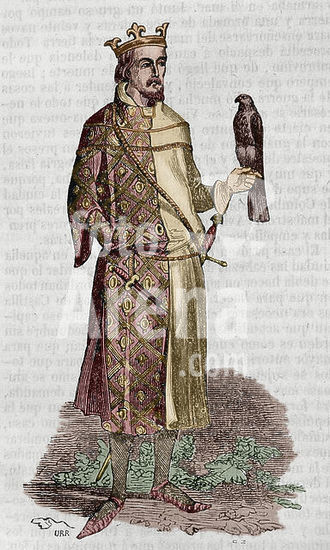 alb5519757 Juan I of Aragon, called the Hunter or the Lover of all Elegance (1350-1396). King of Aragon, Valencia, Mallorca, Sardinia and Corsica, and Count of Barcelona, Roussillon and Sardinia (1387-1396). House of Aragon. Engraving. Later colouration. Historia General de España, by Father Mariana. Madrid, 1852.