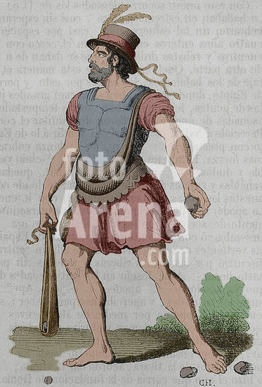 alb5519763 Ancient history. Balearic slingers. Mercenary warriors armed with slingshots in the service of the Roman and Carthaginian armies. Majorcan slinger. Engraving. Later colouration. Historia General de España by Father Mariana. Madrid, 1852.