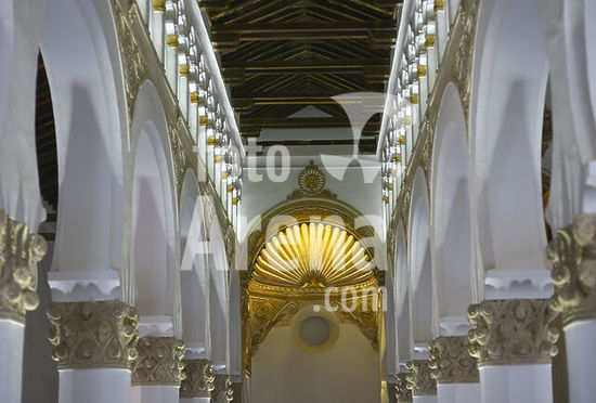 alb5522205 Spain, Castile-La Mancha, Toledo. Synagogue of Santa Maria la Blanca. In 1180 the Jewish community of Toledo financed the construction of the church in Mudejar style, work that was carried out by Muslim builders. Nave with its octagonal pillars, capitals with geometric ornamentation and horseshoe arches.