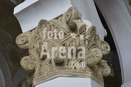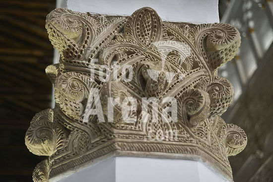 alb5522213 Spain, Castile-La Mancha, Toledo. Synagogue of Santa Maria la Blanca. In 1180 the Jewish community of Toledo financed the construction of the church in Mudejar style, work that was carried out by Muslim builders. Detail of a capital decorated by geometric and vegetable frameworks; mainly stems, pineapples and volutes.