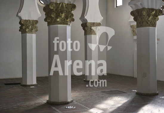 alb5522215 Spain, Castile-La Mancha, Toledo. Synagogue of Santa Maria la Blanca. In 1180 the Jewish community of Toledo financed the construction of the church in Mudejar style, work that was carried out by Muslim builders. Nave with its octagonal pillars and capitals with geometric ornamentation.