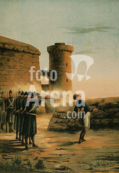 alb5564873 Luis Lacy Gautier (1775-1817). Spanish general who stood out for his actions in Catalonia during the Peninsular War. He was executed by firing squad on 5 July 1817 at Bellver Castle in Palma de Mallorca. Execution of General Lacy. Chromolithography. "Historia de la Revolución Española" (desde la Guerra de la Independencia a la Restauración en Sagunto), by Vicente Blasco Ibáñez. Volume I. Published in Barcelona, 1890.
