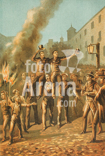 alb5564880 History of Spain. Liberal Triennium (1820-1823). First liberal government of the Triennium (April 1820). The liberal deputies of different factions (moderate and radical) José Canga Argüelles (1771-1842) and Antonio Alcalá Galiano (1789-1865) are carried in triumph by the people of Seville, after a session of the Cortes, held in the church of the Jesuit College of San Hermenegildo. Both politicians had prioritised patriotic sentiment over political party confrontation and were honoured by the people. This is how the revolutionary people responded to the threats of the Holy Alliance. Due to the advance of the Hundred Thousand Sons of Saint Louis, the Cortes moved to Seville (from April to June 1823). Illustration by Serra Pausas. Chromolithography. Historia de la Revolución Española (desde la Guerra de la Independencia a la Restauración en Sagunto), by Vicente Blasco Ibáñez. Volume II. Published in Barcelona, 1891. Author: Joan Serra Pausas (active 1861-1902). Spanish artist.