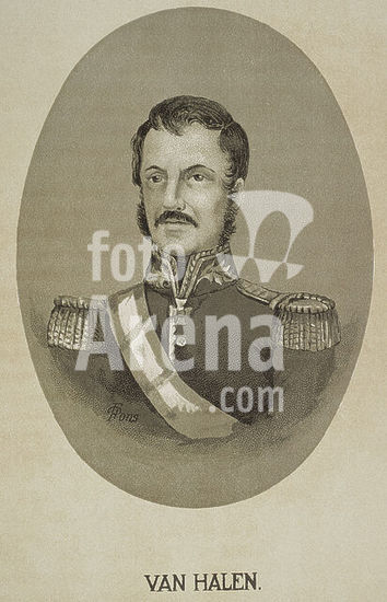 alb5564889 Antonio Van Halen Sarti (1792-1858). Spanish marine and military. He took part in the Peninsular War, Spanish-American War and First Carlist War. As Captain General of Catalonia during Espartero's Regency, in November 1842 he ordered the bombardment of the city of Barcelona. Portrait. "Historia de la Revolución Española" (desde la Guerra de la Independencia a la Restauración en Sagunto), by Vicente Blasco Ibáñez. Volume II. Published in Barcelona, 1891.