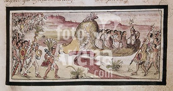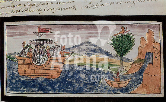 orz000827 The Spies of Moctezuma are Observing the Ships of Grijalba. 16th century manuscript. Madrid, national library. Author: DIEGO DURAN DIEGO (1537-1588). Location: BIBLIOTECA NACIONAL-COLECCION. MADRID. SPAIN. GRIJALBA JUAN DE.