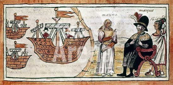 orz000828 Spanish school. Conquest of Mexico : Arrival of Ships and Hernan Cortes is Meeting Marina. Conquista de Mexico : Llegada de naves y Hernan Cortés conoce a Marina. 16th century manuscript. Madrid, national library. Author: DIEGO DURAN DIEGO (1537-1588). Location: BIBLIOTECA NACIONAL-COLECCION. MADRID. SPAIN. HERNAN CORTES. MARINA DOÑA. Malinche.