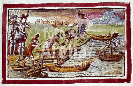 orz000829 Conquest of Mexico : Hernan Cortes is Ordaining the Constuction of Bergantinos. Conquista de Mexico : Hernan Cortés manda construir Bergantinos. 1581 Manuscript . Madrid, national library. Author: DIEGO DURAN DIEGO (1537-1588). Location: BIBLIOTECA NACIONAL-COLECCION. MADRID. SPAIN.