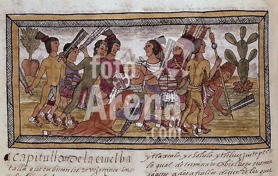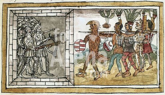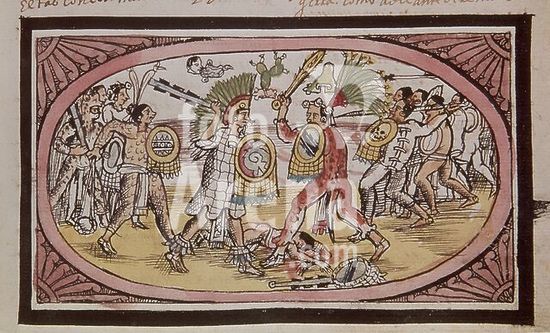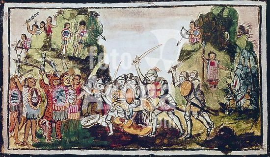 orz012334 Aubin codex: Hernán Cortés fighting the Indians. 16th century. Madrid, National Library. Author: DIEGO DURAN DIEGO (1537-1588). Location: BIBLIOTECA NACIONAL-COLECCION. MADRID. SPAIN.