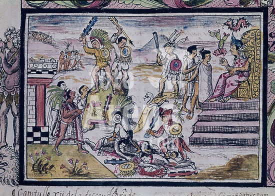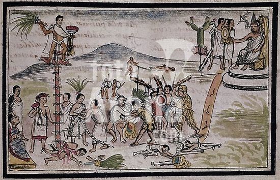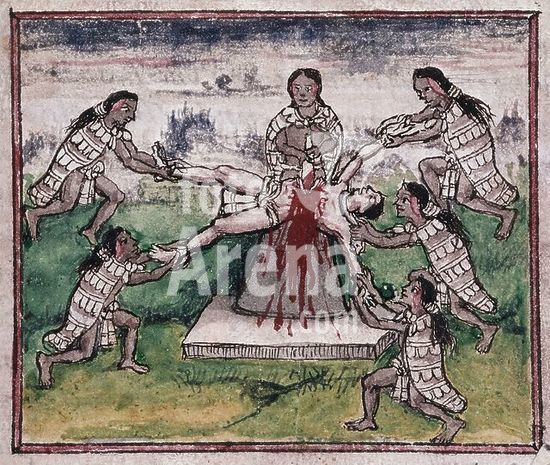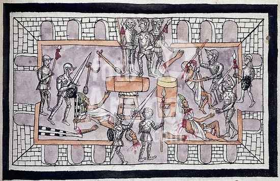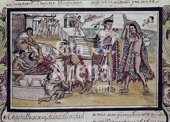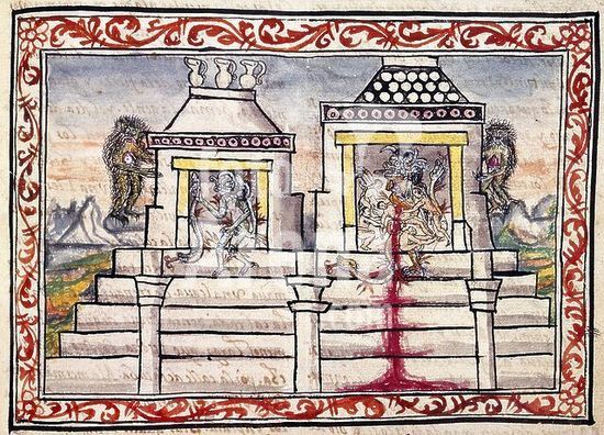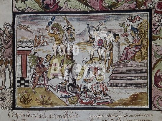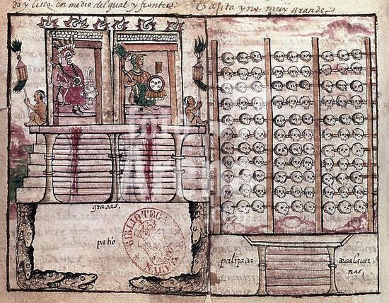 orz012335 Aztec sacrificial altar and Tzompantli with skulls, miniature from a Spanish manuscript, 16th Century. Aztec Civilization. Author: DIEGO DURAN DIEGO (1537-1588). Location: BIBLIOTECA NACIONAL-COLECCION. MADRID. SPAIN.