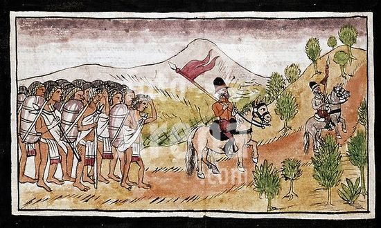 orz012326 Aubin codex: Hernan Cortes riding to Mexico. 16th century. Madrid, National library. Author: DIEGO DURAN DIEGO (1537-1588). Location: BIBLIOTECA NACIONAL-COLECCION. MADRID. SPAIN.