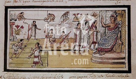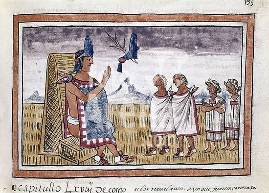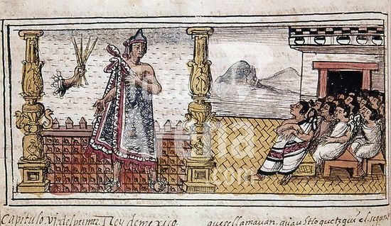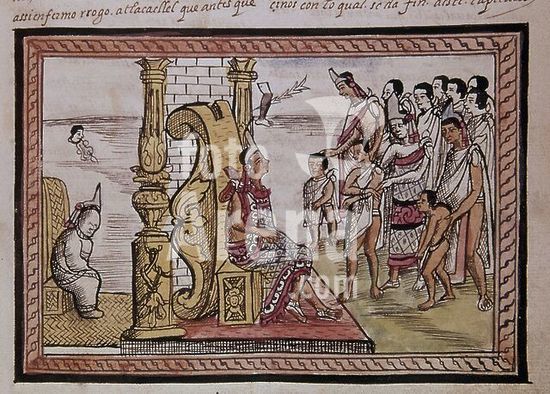 orz000803 History of the Indians of New Spain : Moctezuma is accepting the crown of a prince. 1502. Madrid, national library. Author: DIEGO DURAN DIEGO (1537-1588). Location: BIBLIOTECA NACIONAL-COLECCION. MADRID. SPAIN.