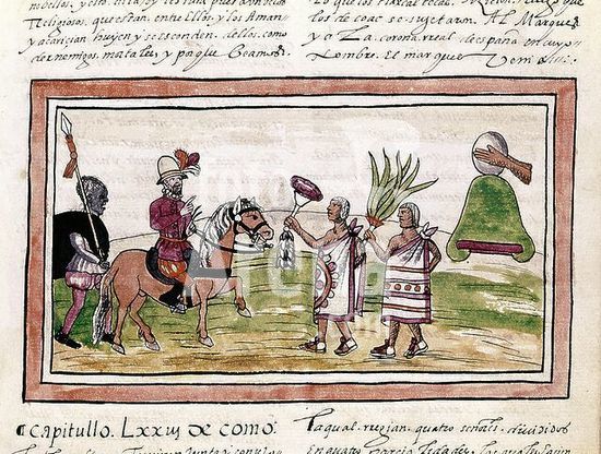 orz012332 Aubin codex: Hernan Cortes receiving offerings from caciques. 16th century. Madrid, National Library. Author: DIEGO DURAN DIEGO (1537-1588). Location: BIBLIOTECA NACIONAL-COLECCION. MADRID. SPAIN.