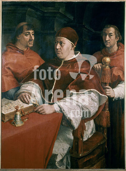 orz021497 Portraits of Leo X (1475-1521) Cardinal Luigi de' Rossi and Giulio de Medici (1478-1534) - 1518 - 155,5x119,5 cm - oil on panel - Italian Renaissance. Author: RAFAEL SANZIO O RAFAEL DE URBINO (1483-1520). Location: PALACIO PITTI-GALERIA PALATINA. Florenz. ITALIA. GIULIO DE MEDICI 1478/1534 PAPA CLEMENTE VII. JUAN DE MEDICIS LEON X (1475/1521). JUAN DE MEDICIS-PAPA LEON X. LORENZO DE MEDICIS (HIJO). GIOVANI DE LORENZO DE MEDICIOS LEON X (1475/1521). LUIS DE ROSSI (1474-1519) CARDENAL ROSSI.