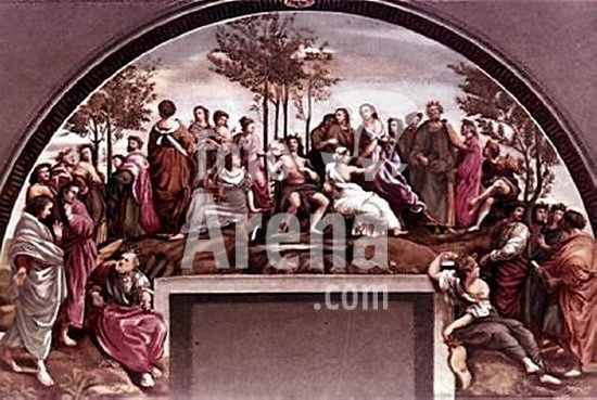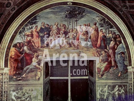 orz138304 Parnassus, from the Stanza della Segnatura - 16th century - fresco - Italian Renaissance. Author: RAFAEL SANZIO O RAFAEL DE URBINO (1483-1520). Location: MUSEOS VATICANOS-ESTANCIA DEL SELLO. VATICANO. Apollo.