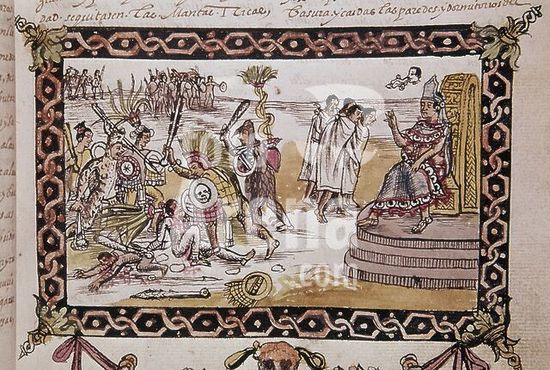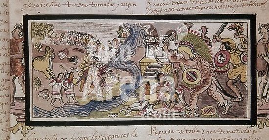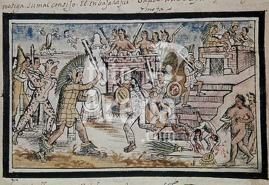 orz003425 The Spaniards' arrogant behaviour causes resistance among the Aztecs. Massacre to smother the resistance. 1320. Madrid, National Library. Author: DIEGO DURAN DIEGO (1537-1588). Location: BIBLIOTECA NACIONAL-COLECCION. MADRID. SPAIN.