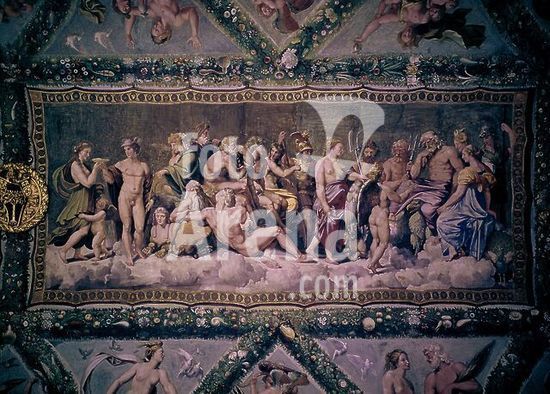 orz050511 CONCILIO DE LOS DIOSES - FABULA DE PSICHE - INSPIRADA EN EL ASNO DE ORO DE APULEYO - SIGLO XVI. Author: RAFAEL SANZIO O RAFAEL DE URBINO (1483-1520). Location: PALACIO FARNESIO. Rome. ITALIA. PSYCHE (MYTHOLOGY). PSIQUIS.