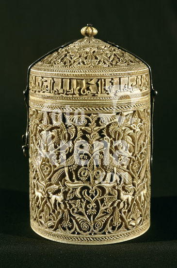 orz067946 Ivory pyxis from the Medina de Azahara. 964. Madrid, National Archaeological Museum. Location: MUSEO ARQUEOLOGICO NACIONAL-COLECCION. MADRID. SPAIN.