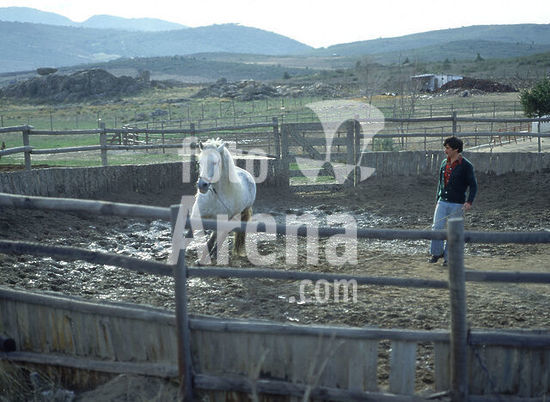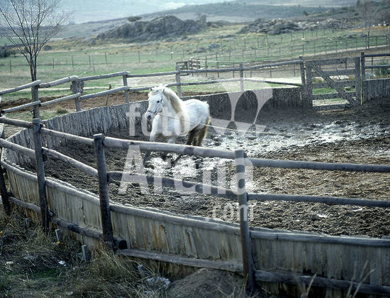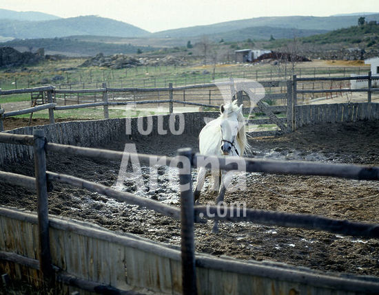 orz088651 CABALLO BLANCO EN EL PICADERO. Location: ESCUELA DE EQUITACION. MANZANARES EL REAL. MADRID. SPAIN.