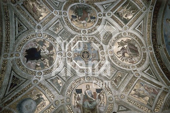 orz172224 FRESCO DE LA BOVEDA - JUSTICIA (DR) FILOSOFIA (AR) POESIA (IZQ) Y TEOLOGIA (AB) - RESTAURADO - 1508. Author: RAFAEL SANZIO O RAFAEL DE URBINO (1483-1520). Location: MUSEOS VATICANOS-ESTANCIA DEL SELLO. VATICANO.