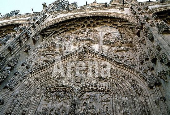orz184116 FACHADA PRINCIPAL- RELIEVES DEL NACIMIENTO Y DE LA ADORACION EN LA PORTADA CENTRAL- S XVI/XVII. Author: JUAN GIL DE HONTAÑON. Location: CATEDRAL NUEVA. SALAMANCA. SPAIN.