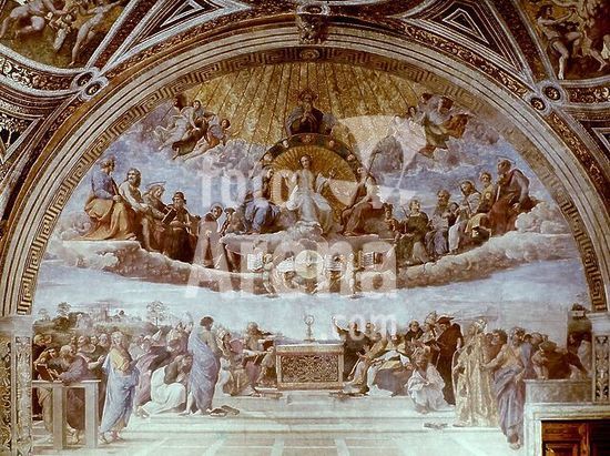 orz201736 Disputa, from the Stanza della Segnatura - 1509 - fresco. Author: RAFAEL SANZIO O RAFAEL DE URBINO (1483-1520). Location: MUSEOS VATICANOS-ESTANCIA DEL SELLO. VATICANO. JESUS. EVE. FRA ANGELICO. Adam. APOSTLE PETER. DAVID REY SIGLO XI AC. VIRGIN MARY. ESPIRITU SANTO. SAN JUAN EVANGELISTA Y APOSTOL. DIOS PADRE. SAN GREGORIO MAGNO. Trinidad. SAN LORENZO. DIOS. SAINT AMBROSE. DIOS HIJO. SIXTO IV PAPA. SAN JERONIMO (347-420). Dante Alighieri (1265-1321). SAN AGUSTIN (354-430). JUDAS ISCARIOTE (3 ac-30 dc). SAN JUAN BAUTISTA (8 AC / 27 DC).