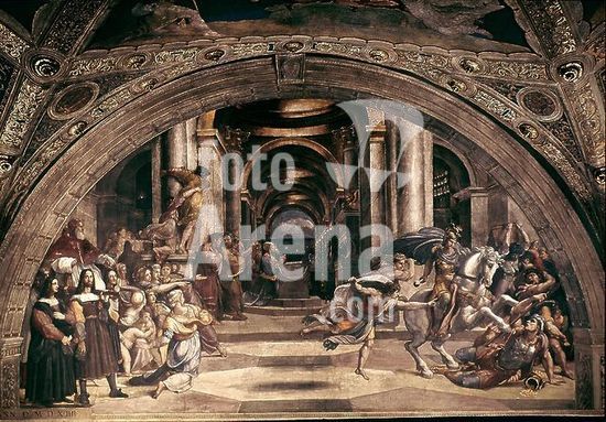 orz201737 HELIODORO EXPULSADO DEL TEMPLO- FRESCO DE LA ESTANCIA DE HELIODORO- 1511/1514. Author: RAFAEL SANZIO O RAFAEL DE URBINO (1483-1520). Location: MUSEOS VATICANOS-ESTANCIA DEL HELIODORO. VATICANO. JULIUS II POPE. HELIODOR. ONIAS.