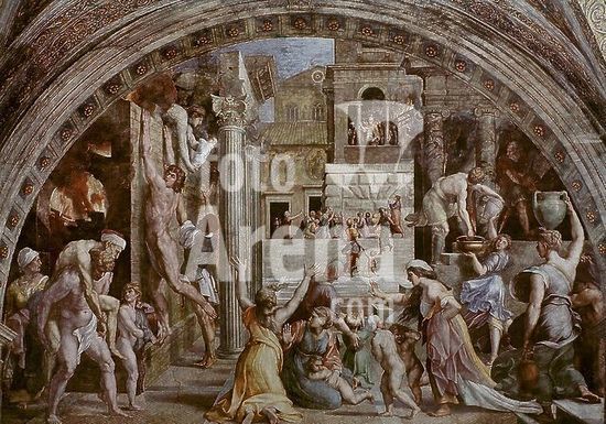 orz169646 EL INCENDIO DEL BORGO - 1514-17 - VISTA DEL CONJUNTO - RESTAURADO. Author: RAFAEL SANZIO O RAFAEL DE URBINO (1483-1520). Location: MUSEOS VATICANOS-ESTANCIA DEL INCENDIO. VATICANO. AENEAS. ANCHISES. ASCANIUS. PAPA LEON IV. LEON IV PAPA. Creusa.