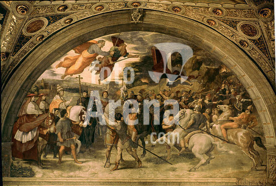 orz201764 Pope Leo I repulsing Attila - 1512/14 - fresco. Author: RAFAEL SANZIO O RAFAEL DE URBINO (1483-1520). Location: MUSEOS VATICANOS-ESTANCIA DEL HELIODORO. VATICANO.