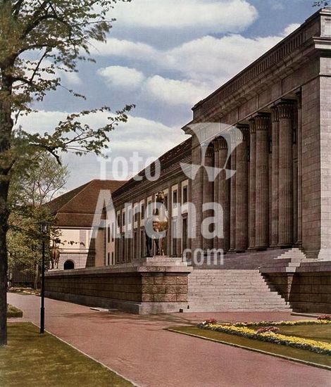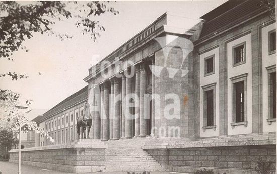 akg057427 Berlin-Mitte, Neue Reichskanzlei. (1938 erbaut von Albert Speer). Teilansicht der Gartenfront von Nordosten mit Pferdeskulptur von Josef Thorak. Foto, um 1940.
