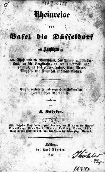 akg105138 Baedeker, Karl Buchhändler und Verleger, 1801-1859. Werke: Rheinreise von Mainz bis Cöln. (Reisebeschreibung von Röhling, von Baedeker erweitert). Titelseite der 6. verbesserten und vermehrten Auflage: "Rheinreise von Basel bis Düsseldorf", Koblenz, Karl Baedeker, 1849.
