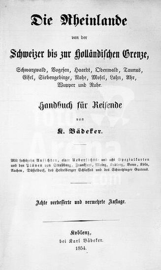 akg105139 Baedeker, Karl Buchhändler und Verleger, 1801-1859. Werke: Rheinreise von Mainz bis Cöln. (Reisebeschreibung von Röhling, von Baedeker erweitert). Innentitel der 8. verbesserten und vermehrten Auflage: "Die Rheinlande von der Schweizer bis zur Holländischen Grenze". Koblenz, Karl Baedeker, 1854.