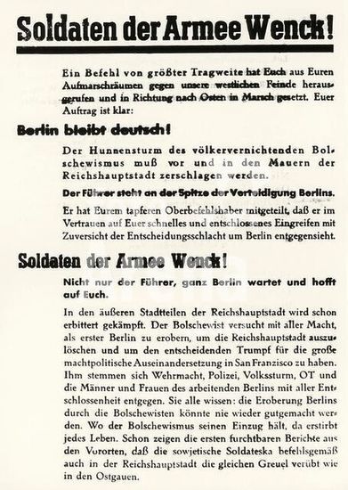 akg136472 World War Two / The capture of Berlin by the Red Army, April 1945. Plea to the German soldiers of the Wenck division to defend Berlin: "The Hun Storm of genocidal Bolshevism must be destroyed before the walls of the Reich Capital (...) ". Leaflet, around April 1945.