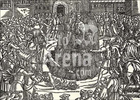 akg151676 Attempt to re-catholize England and the persecution of protestants by Queen Mary I, 1553-1558. "Smithfiels, Place of Executions". Contemporary woodcut. Author: ANONYMOUS.