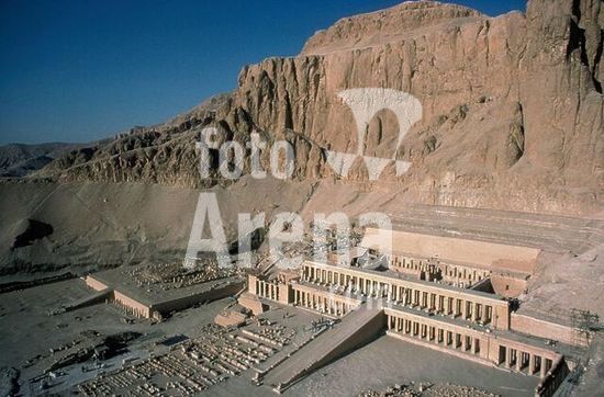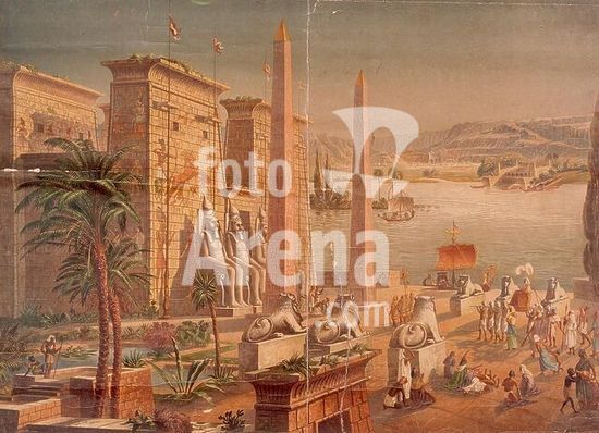 akg162491 Luxor, Arabic Al-Uqsur (Upper Egypt), Amon Temple. (built under Amenhotep III c. 1400 BC; extended under Ramses II). Luxur in Pharaonic times. Colour lithograph, unsigned School mural, no loc.& date (bibliographical details covered). Dortmund, Westfälisches Schulmuseum. Museum: Dortmund, Westfälisches Schulmuseum.